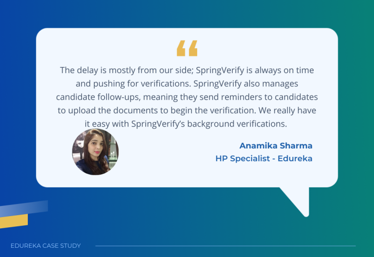 We spoke to Anamika Sharma – Human Resources Specialist at Edureka, about her experience using SpringVerify. Below is a transcription of her responses during our discussion.