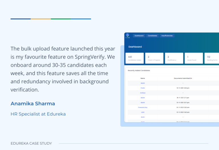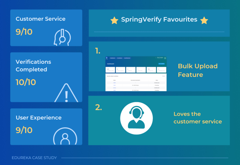 I’m delighted with the service of SpringVerify. Even if I leave and someone else takes over, SpringVerify is very simple and easy to adapt to. In addition, customer support is beneficial and has made the background verification process a pleasant experience for us here at Edureka.